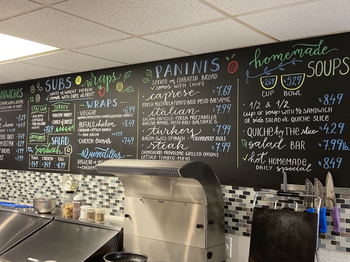 The menu at Fresh Box Cafe offers a variety of options suitable for breakfast, lunch, and light meals. It features a selection of healthy snacks, sandwiches, homemade soups, and daily hot specials, providing choices for those looking for quick or casual dining.